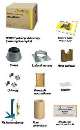 Schiedel RONDO wyposażony jest w dodatkowe elementy pozwalające na wybudowanie kompletnego komina. Konieczne do budowy drobne elementy znajdują się w pakiecie podstawowym.