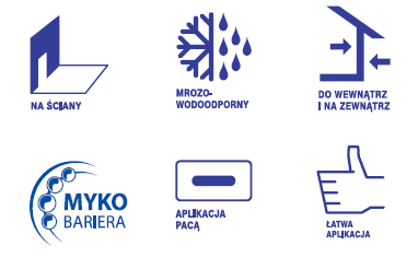 zapewniających wysoką szczelność strukturalną wyprawy. Postępujący w czasie proces karbonatyzacji tynku mineralnego powoduje dalsze zmniejszenie nasiąkliwości, twardzenie struktury i zwiększenie odporności na agresję chemiczną środowiska. MYKO BARIERA – wysoka alkaliczność wyprawy tynkarskiej i hydrofobizacja stanowią naturalną ochronę przed rozwojem grzybów rozkładu pleśniowego oraz alg – szczególnie dotyczy to obiektów usytuowanych w pobliżu skupisk zieleni i zbiorników wodnych, w miejscach zacienionych w centrach miast gdzie występuje duża koncentracja zanieczyszczeń. Nie przyciąga kurzu, brudu i pyłków unoszących się w powietrzu. Możliwość nakładania maszynowego za pomocą rekomendowanych agregatów tynkarskich.